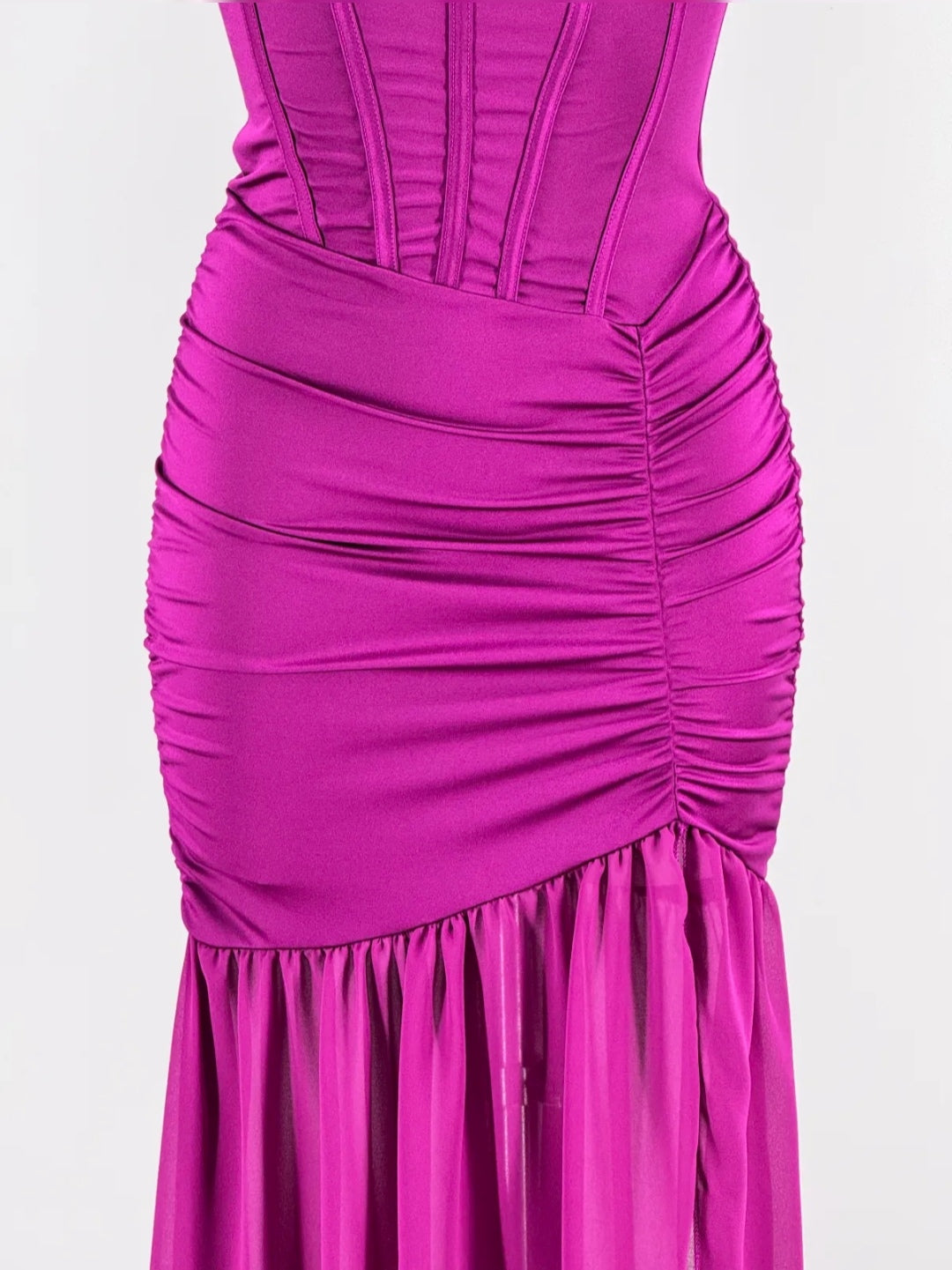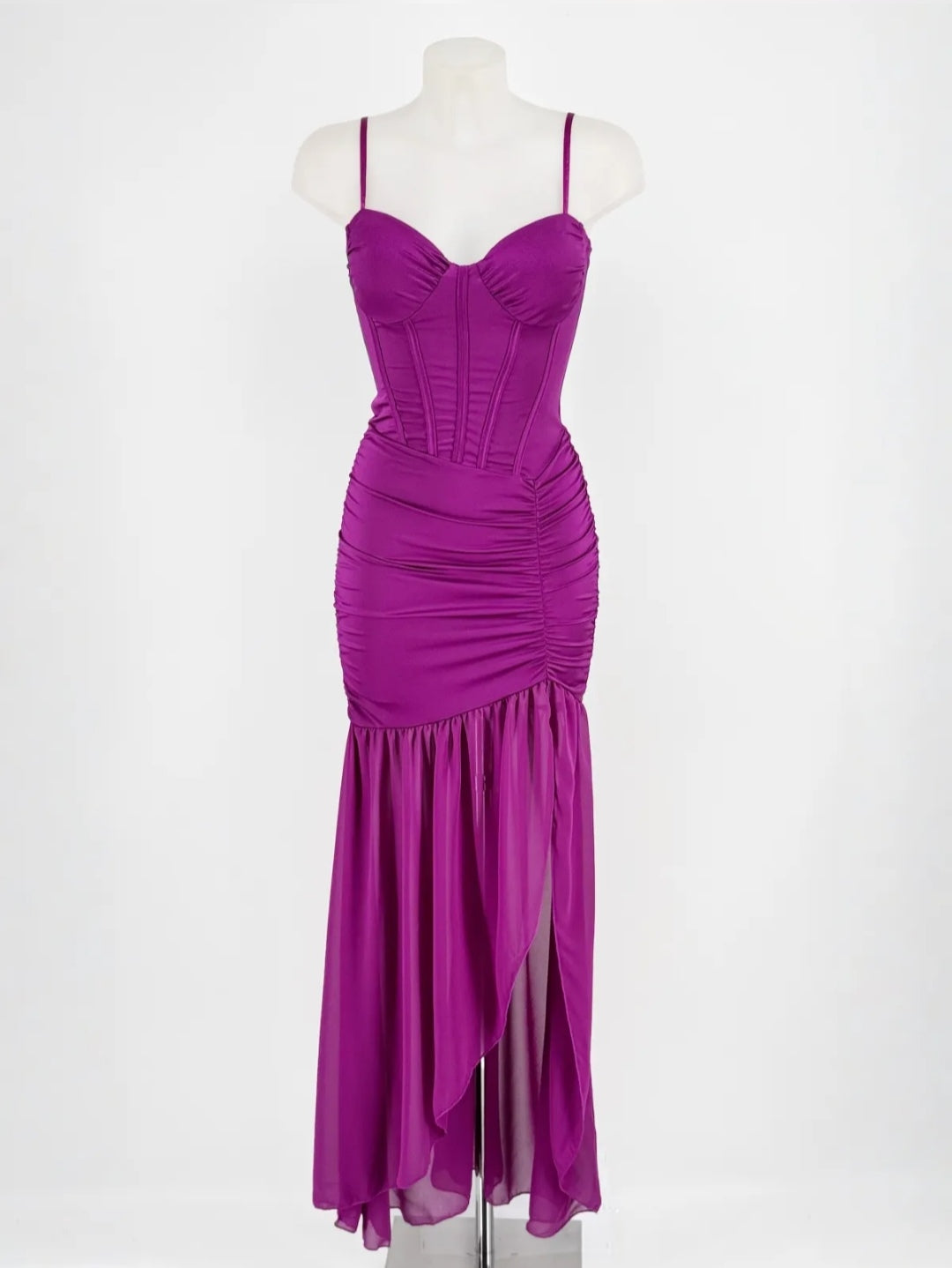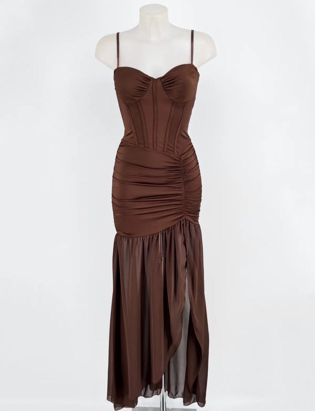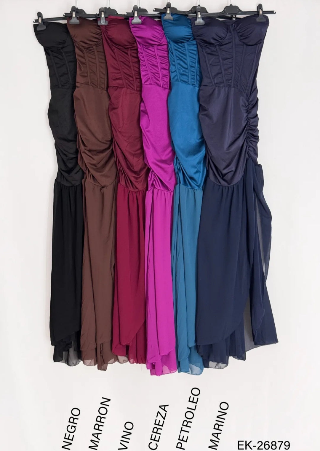 Vestido largo con Tirantes, cuerpo tipo corsé y falda drapeado con bajo asimétrico.