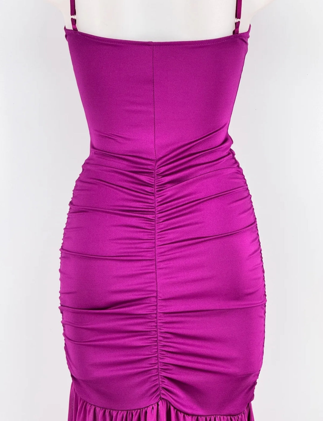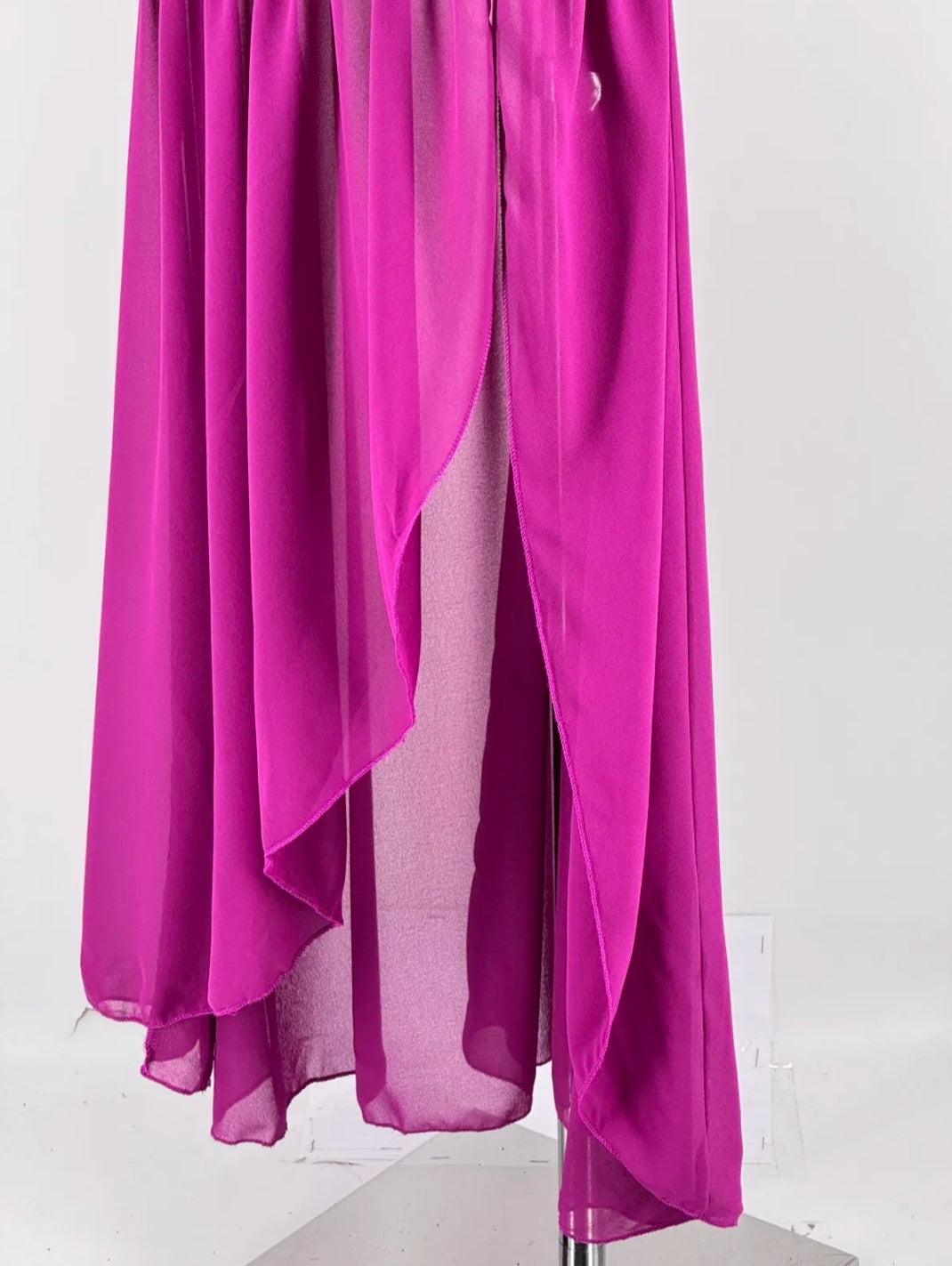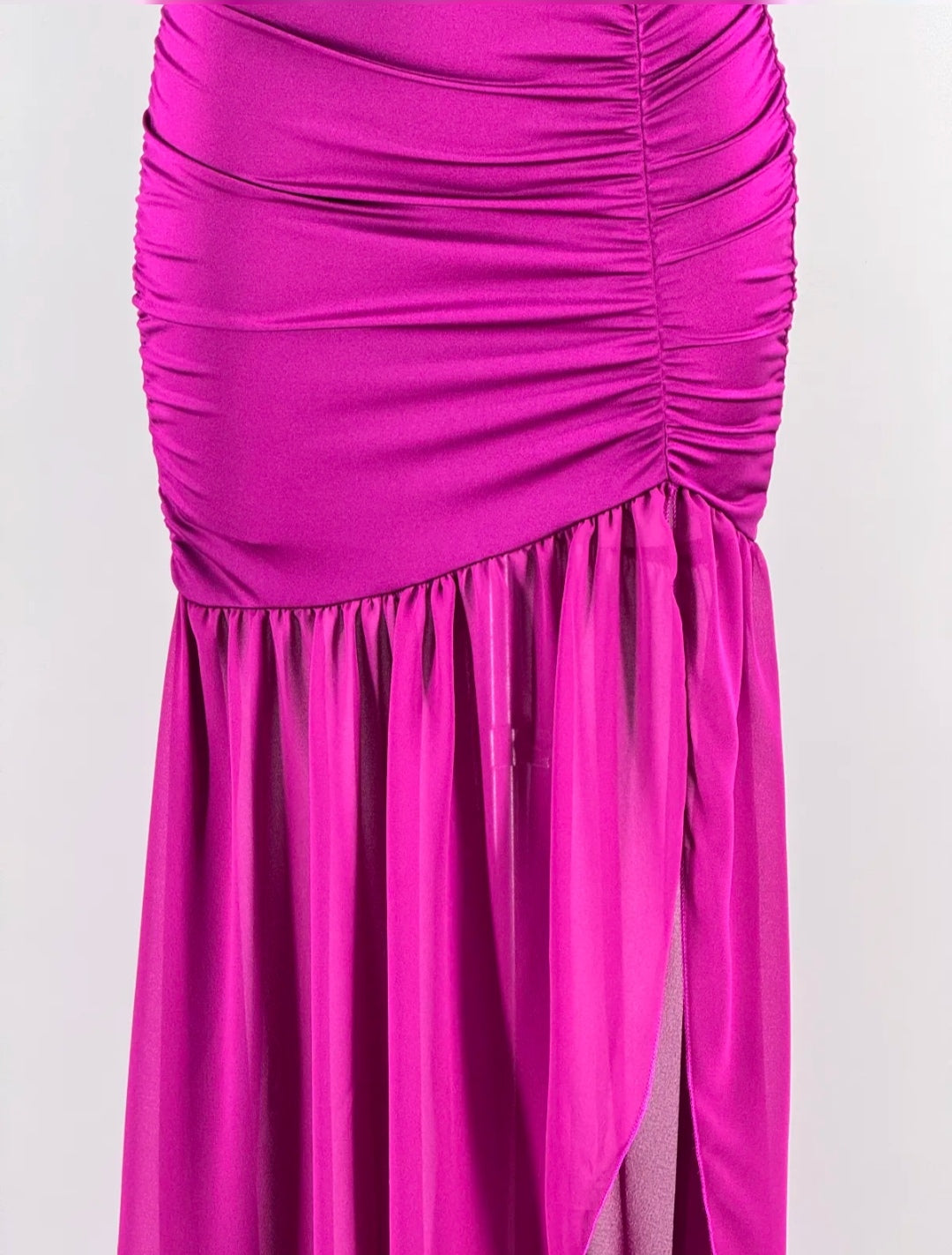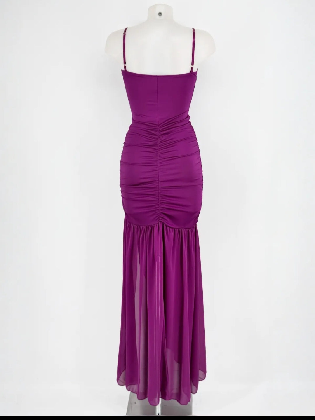 Vestido largo con Tirantes, cuerpo tipo corsé y falda drapeado con bajo asimétrico.